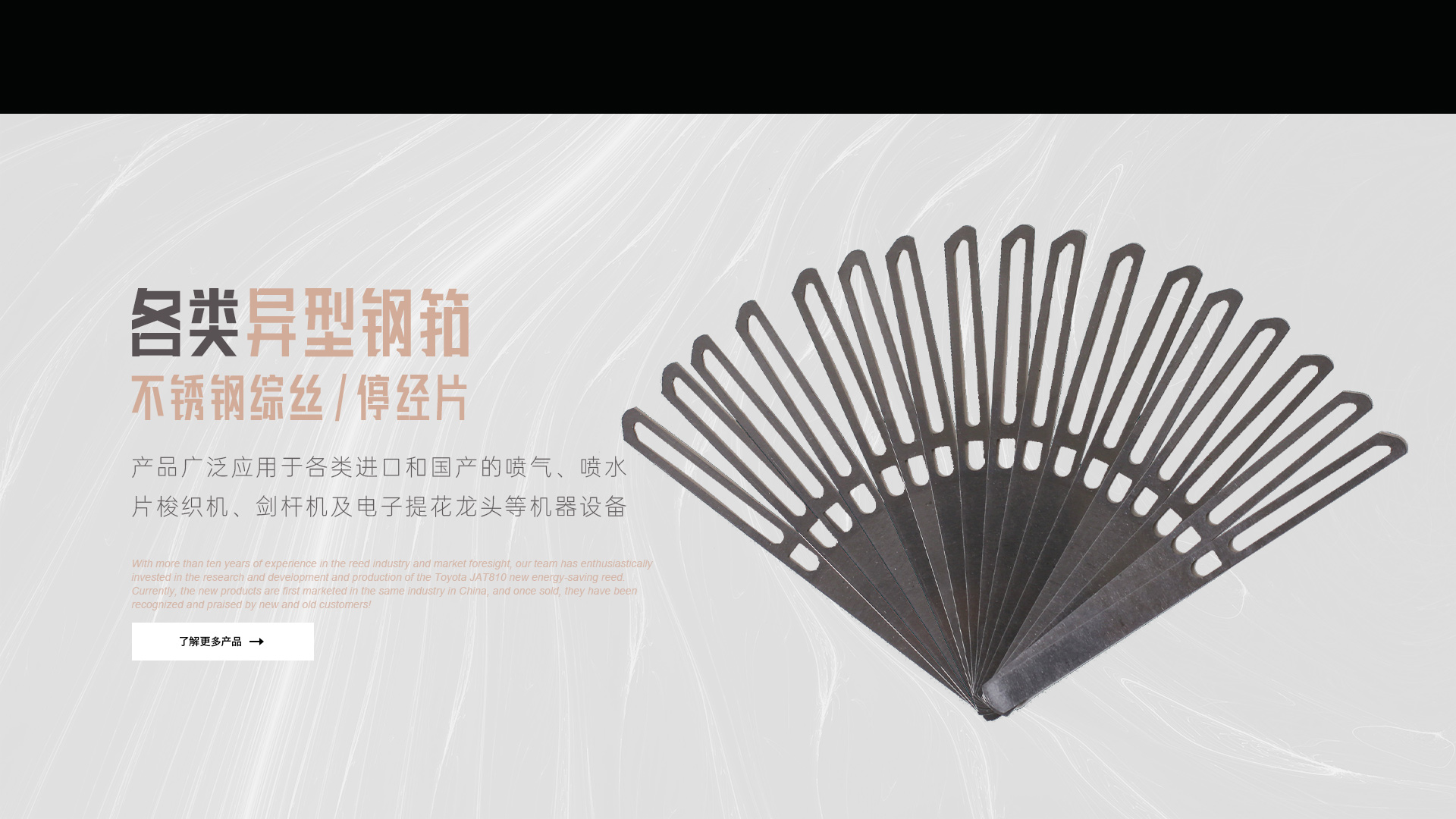 公司主要產(chǎn)品有:噴氣織機(jī)用各類(lèi)異型鋼筘(傳統(tǒng)型豐田JAT710鋼筘及新研發(fā)的豐田JAT810節(jié)能筘);不銹鋼綜絲及不銹鋼停經(jīng)片。我們的產(chǎn)品廣泛應(yīng)用于各類(lèi)進(jìn)口和國(guó)產(chǎn)的噴氣、噴水、片梭織機(jī)、劍桿機(jī)及電子提花龍頭等機(jī)器設(shè)備。